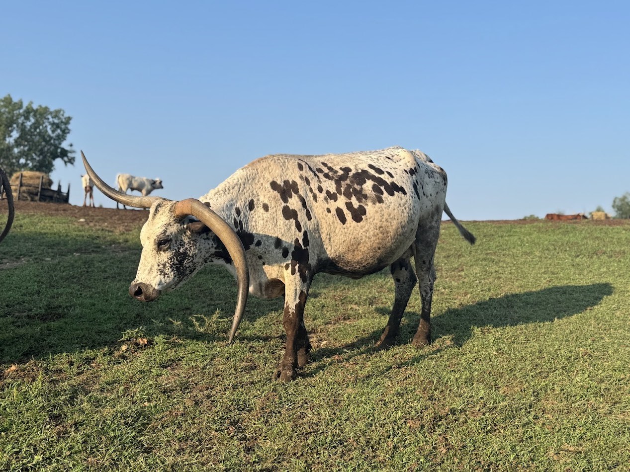 Beautiful Black and White Cow! She has a number of great progeny that have sold for high prices at sales. She sustained an injury in the winter of 20/21 that caused her horn to droop, now she uses it to her advantage moving other cows out of her way.